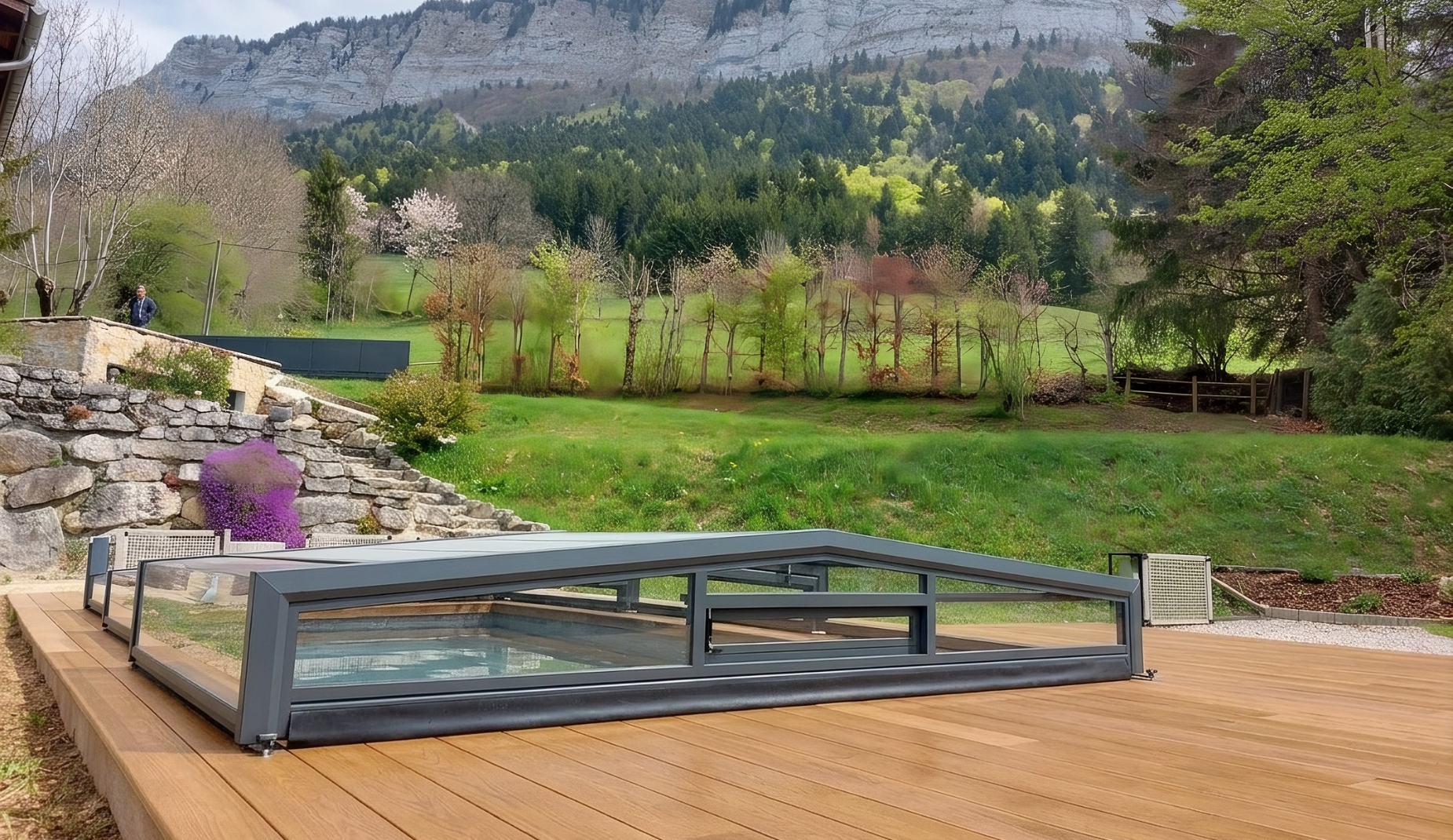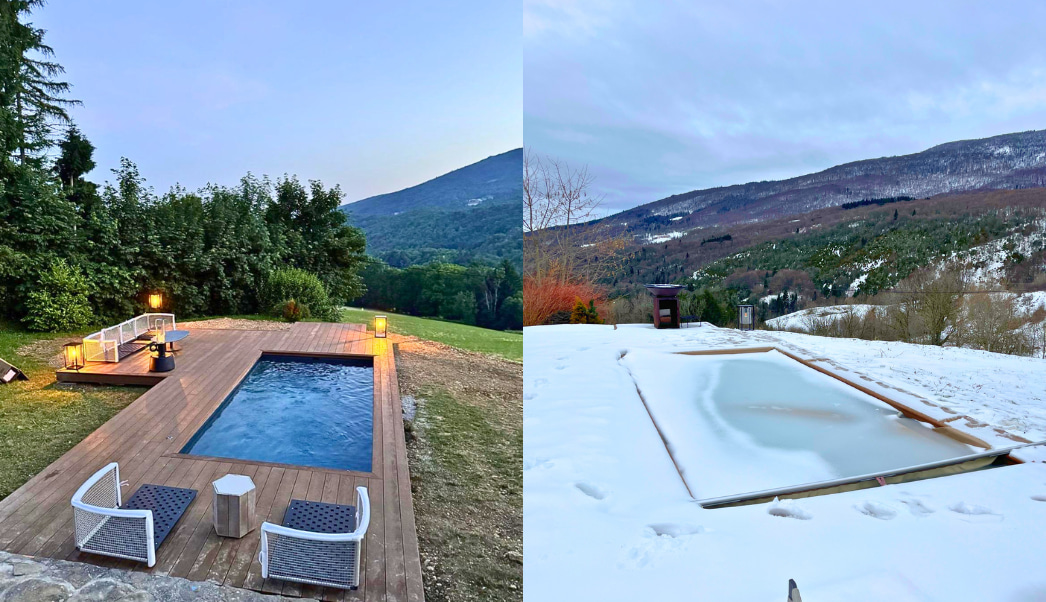 Sophie souhaitait protéger sa piscine des feuilles et du pollen de son jardin entouré d’arbres. Pour cela, elle voulait une protection de bassin esthétique et sécurisée, mais surtout sans aucun effort de manipulation. Elle souhaitait préserver la vue dégagée sur les montagnes.