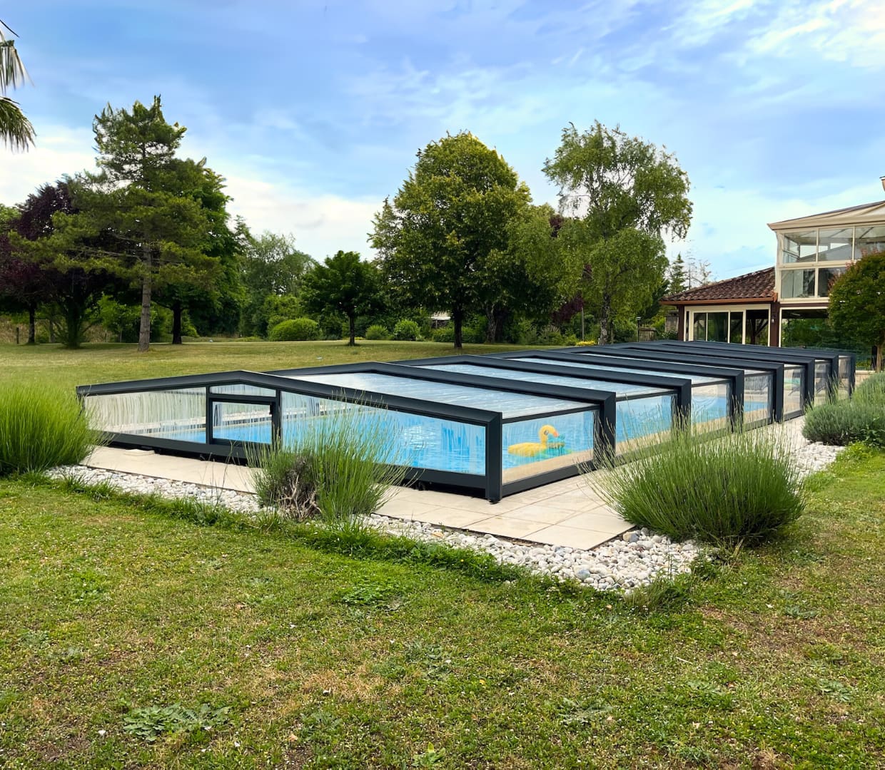 Déjà propriétaire d’un abri de piscine cintré et blanc, la cliente souhaitait apporté de la modernité à leur jardin, en optant pour une couleur foncée et des lignes angulaires . Leur priorité : continuer de pouvoir se baigner sous l’abri, même fermé.