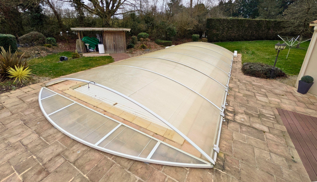 Adieu l'ancien abri blanc vieilli par le temps et endommagé par la tempête. La piscine de Frédéric est bien couverte malgré sa grande taille et sa manipulation reste simple grâce aux éléments télescopiques avec les roulettes intégrées à la structure.