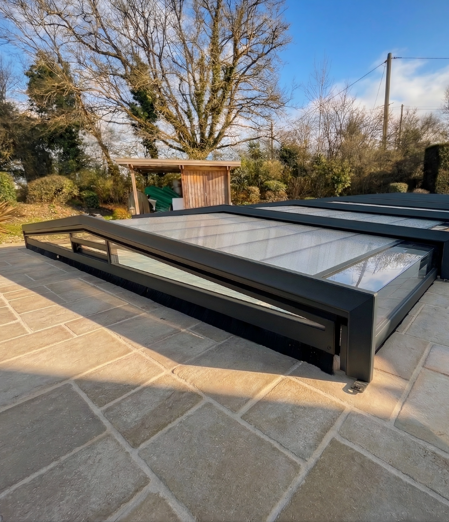 Aujourd’hui, l’ancien dôme de piscine a laissé place à l’élégance contemporaine grâce à l’abri Kandis aux profilés angulaires.