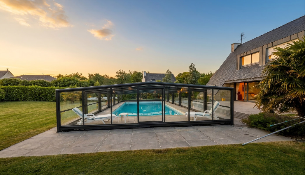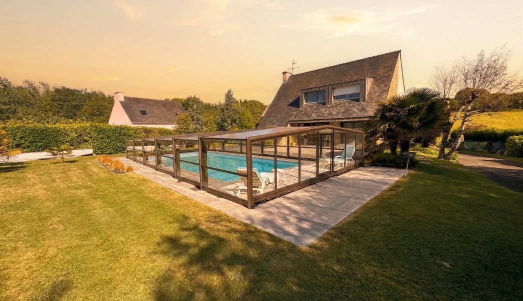 Jacques a fait le choix d'un abri en vitrage, plus résistant. La taille semi-haute de son abri lui permet de prolonger sa période de baignade et profiter de moments en famille avec ses petits enfants.