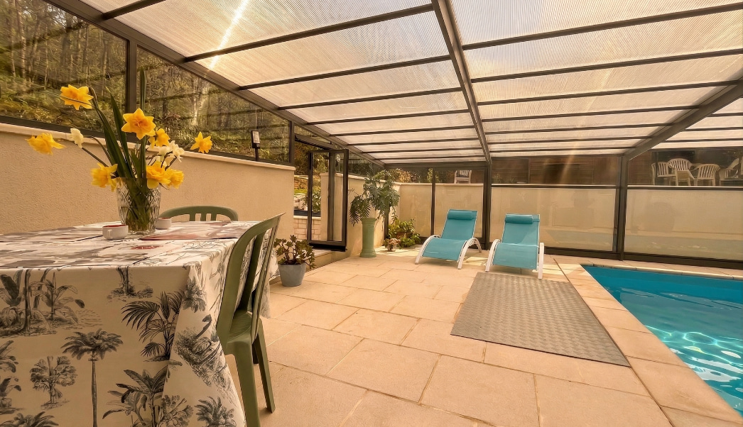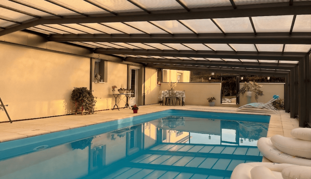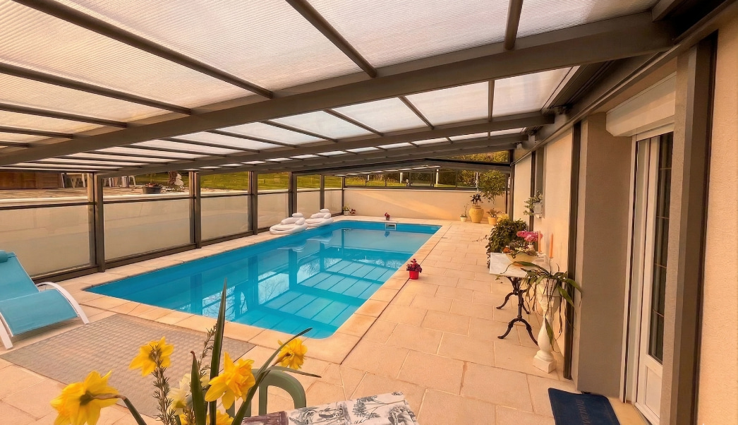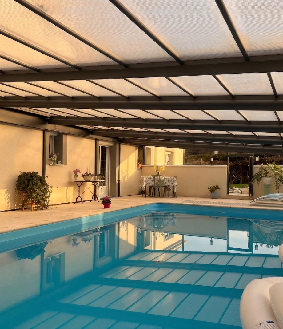 Doté de 2 éléments fixes et de 5 éléments télescopiques, l’abri épouse aujourd’hui parfaitement les contraintes du bassin. Une vrai abri de piscine technique qui transforme un bassin en un prolongement de la maison !